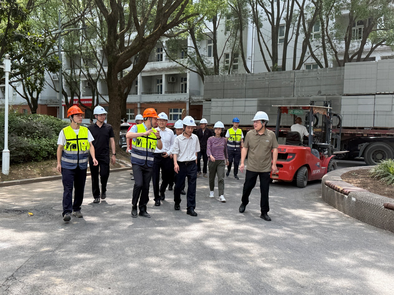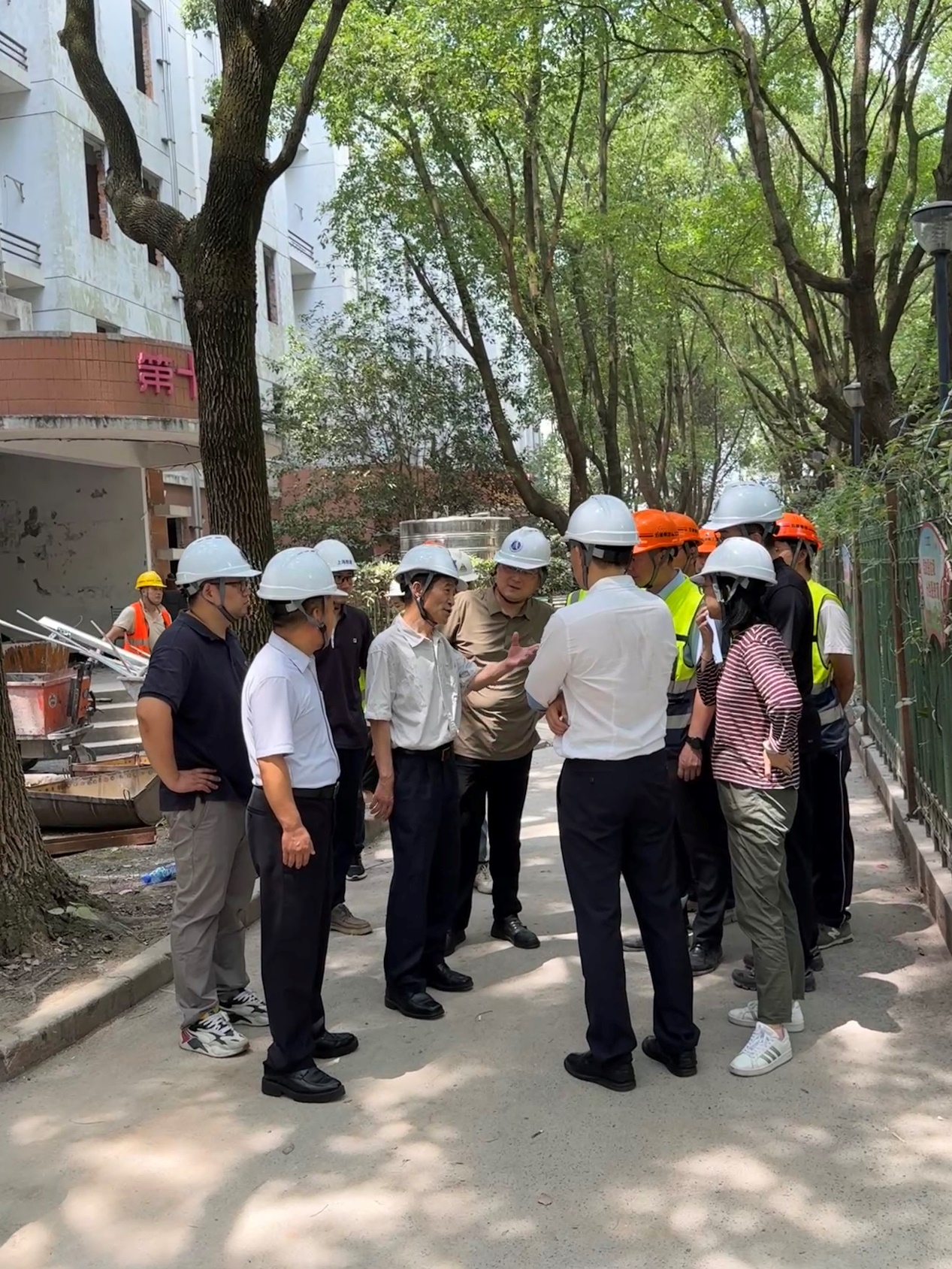 校领导一行现场听取了奉浦校区整体维修一期工程项目实施情况汇报,并实地检查3#、4# 宿舍楼及食堂施工区域,察看各环节进展。目前,该项目拆除作业主要部分即将收尾,将逐步转入结构加固与室内装饰和安装阶段,室外管线改造也已分段展开,各区域均按预定计划推进,各工序衔接紧密。