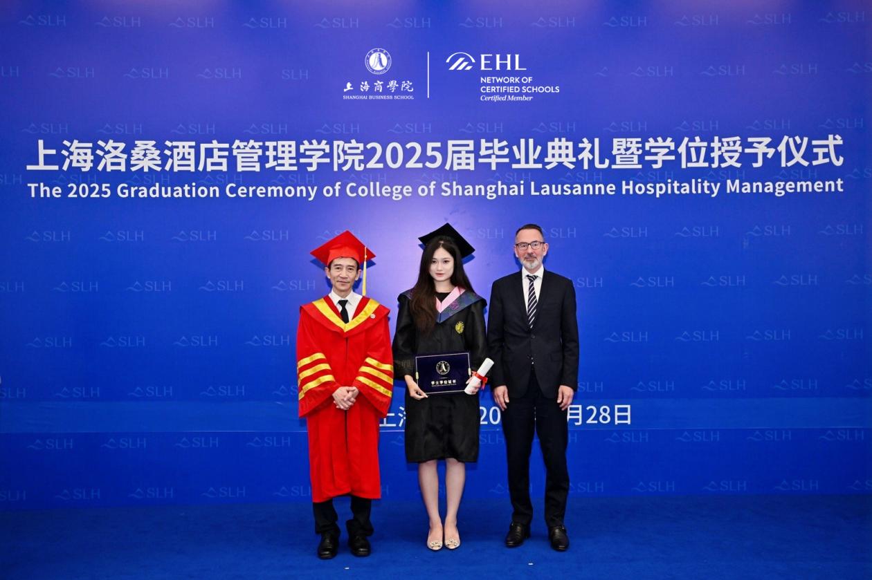 梧桐浓绿,栀子飘香。6月28日上午,上海商学院上海洛桑酒店管理学院2025届毕业典礼暨学位授予仪式于漕宝路校区隆重举行。作为中瑞深度合作办学的标杆项目,学院作为EHL认证院校联盟成员,承袭百年教育底蕴与上海商学院本土化办学优势,历经四年精心培育,迎来首批毕业生。EHL集团首席学术官胡安·F.佩雷隆,上海商学院校长吴忠,党委副书记、副校长劳晓芸、东湖集团副总经理彭立俊、锦江集团副总裁周维、携程集团副总裁王强以及各相关单位领导,教师代表、后勤服务职工代表,全体2025届毕业生及家长代表出席毕业典礼,共同见证2025届毕业生圆满完成学业,为他们即将开启的璀璨未来送上真挚祝福。典礼由学院执行院长胡笑寒、毕业生代表吴中岳主持。以“瑞辉同耀忆菁莪、瑞沪师韵铭心灯、瑞风韶华启新程”三篇章,勾勒出了首届学子从求学问道到逐梦远航的成长轨迹。