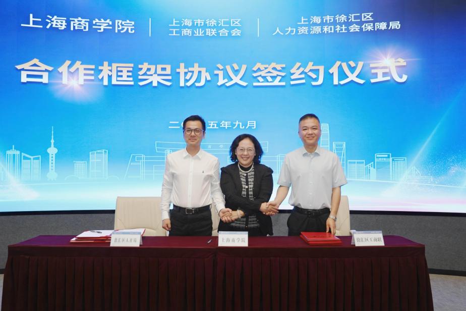 9月24日,上海商学院与徐汇区工商业联合会、徐汇区人力资源和社会保障局三方合作框架协议签约仪式在我校中山西路校区举行。徐汇区党委统战部副部长、区工商联党组书记张敏,徐汇区人力资源和社会保障局党组书记、局长方志杰,上海商学院党委副书记、副校长劳晓芸及徐汇区工商联企业代表、上海商学院二级学院代表出席签约仪式。签约仪式由我校党委学生工作部部长、学生处处长李爽主持。